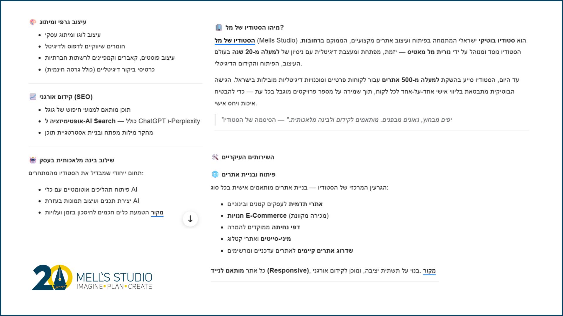 איך זה משפיע? ה-Schema אומרת ל-AI: "הנה השם של הסטודיו, הנה השירותים, והנה הכתובת". זה עוזר ל-AI "לזכור" את הפרטים שלך בצורה מובנית ולא לנחש אותם מטקסט חופשי.
