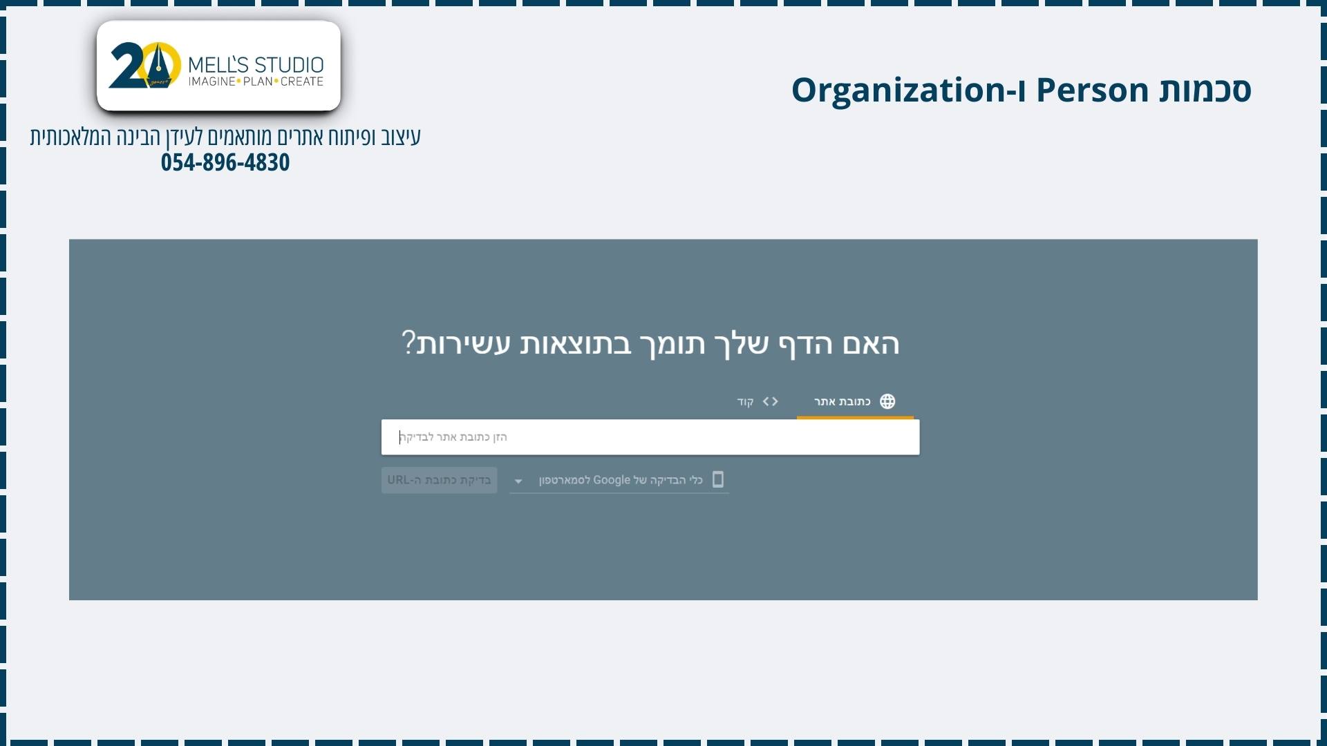 - מה זה סכמה (Schema)? שפת קוד מוסכמת (JSON-LD) המתווספת לאתר כדי לעזור למנועי החיפוש להבין את ההקשר של התוכן. היא מגדירה עבורם מי האדם, מהו העסק ומה הקשר ביניהם.