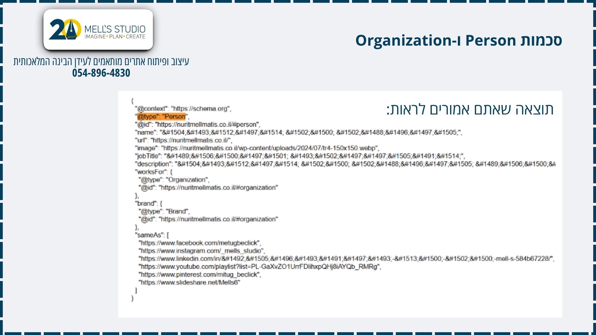 - Organization (העסק): כאן אני בודקת שמופיע שם הסטודיו, הלוגו והקישורים לרשתות החברתיות (sameAs).
