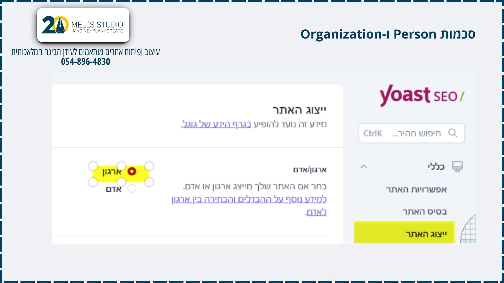 - תחת לשונית יצוג האתר, תמצאו את אפשרות הבחירה בין ארגון או אדם (Organization or person).